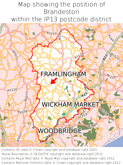 Brandeston is situated roughly centrally between the southernmost and northernmost extremities of the IP13 postcode district, and towards the westernmost extremity of the IP13 postcode district.