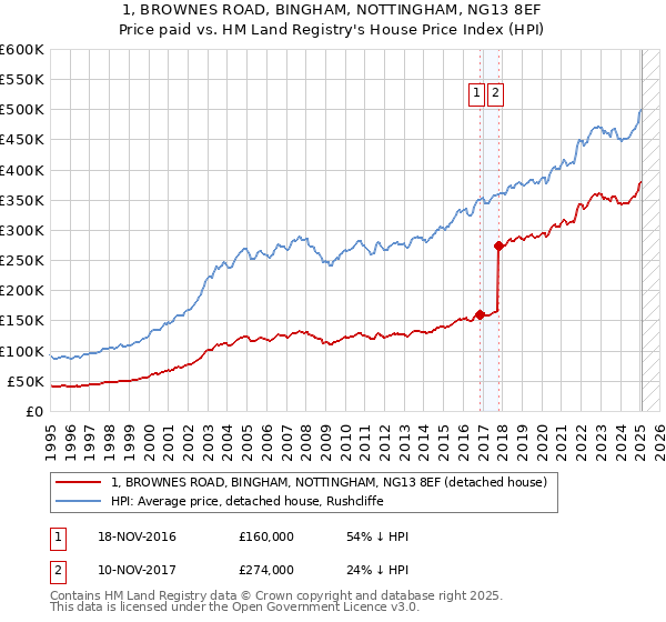 The below graph shows the average detached house price in the Rushcliffe local authority area over time, sourced from the HPI. The two 1 BROWNES ROAD sales from November 2016 and November 2017 have been plotted on the graph. A line has been extrapolated to show what the value of the property might have been over time, following each sale, had it maintained the same margin above or below the HPI (as a percentage). For example, the November 2016 sale was for 54% below the HPI. So the extrapolation line tracks at 54% below the HPI over time, until the November 2017 sale, where it rises to 24% below the HPI. The line then continues to track at 24% below the HPI.