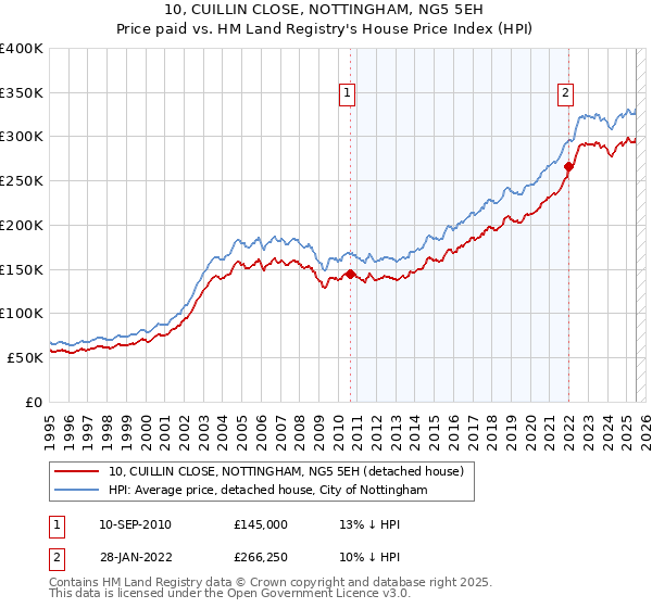 The below graph shows the average detached house price in the City of Nottingham local authority area over time, sourced from the HPI. The two 10 CUILLIN CLOSE sales from September 2010 and January 2022 have been plotted on the graph. A line has been extrapolated to show what the value of the property might have been over time, following each sale, had it maintained the same margin above or below the HPI (as a percentage). For example, the September 2010 sale was for 13% below the HPI. So the extrapolation line tracks at 13% below the HPI over time, until the January 2022 sale, where it rises to 10% below the HPI. The line then continues to track at 10% below the HPI.