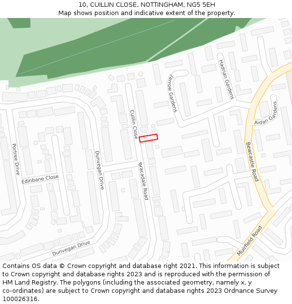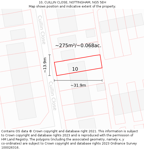 10 CUILLIN CLOSE sits on a plot of roughly 0.068 of an acre, or 275m². The below map shows the location of 10 CUILLIN CLOSE, an approximate outline of the building(s), and the indicative extent of the property. The plot extent is a Land Registry INSPIRE Index Polygon, and it is important to note that a title may include more than one polygon, whereas only one polygon is shown on the map (the polygon which intersects with the position of 10 CUILLIN CLOSE). The full extent of the land contained in any registered title can only be identified from the individual title plan. The maps on this page should not be relied upon to establish the extent of a title.