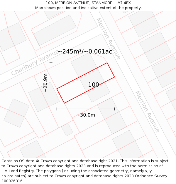 100 MERRION AVENUE sits on a plot of roughly 0.061 of an acre, or 245m². The below map shows the location of 100 MERRION AVENUE, an approximate outline of the building(s), and the indicative extent of the property. The plot extent is a Land Registry INSPIRE Index Polygon, and it is important to note that a title may include more than one polygon, whereas only one polygon is shown on the map (the polygon which intersects with the position of 100 MERRION AVENUE). The full extent of the land contained in any registered title can only be identified from the individual title plan. The maps on this page should not be relied upon to establish the extent of a title.
