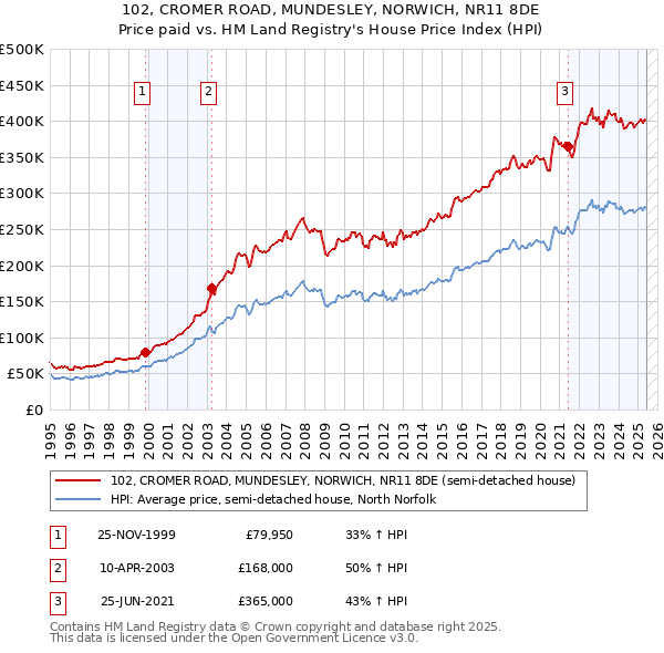 The below graph shows the average semi-detached house price in the North Norfolk local authority area over time, sourced from the HPI. The three 102 CROMER ROAD sales between November 1999 and June 2021 have been plotted on the graph. A line has been extrapolated to show what the value of the property might have been over time, following each sale, had it maintained the same margin above or below the HPI (as a percentage). For example, the April 2003 sale was for 50% above the HPI. So the extrapolation line tracks at 50% above the HPI over time, until the June 2021 sale, where it falls to 43% above the HPI. The line then continues to track at 43% above the HPI.