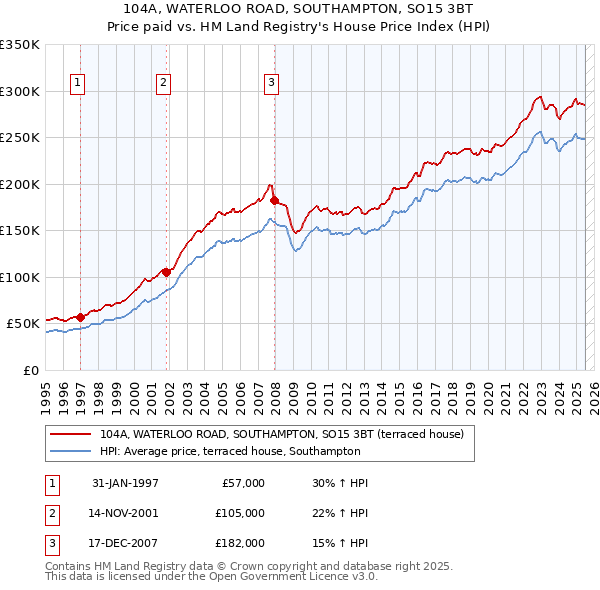 The below graph shows the average terraced house price in the Southampton local authority area over time, sourced from the HPI. The three 104A WATERLOO ROAD sales between January 1997 and December 2007 have been plotted on the graph. A line has been extrapolated to show what the value of the property might have been over time, following each sale, had it maintained the same margin above or below the HPI (as a percentage). For example, the November 2001 sale was for 22% above the HPI. So the extrapolation line tracks at 22% above the HPI over time, until the December 2007 sale, where it falls to 15% above the HPI. The line then continues to track at 15% above the HPI.