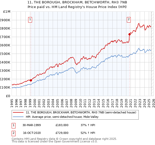 The below graph shows the average semi-detached house price in the Mole Valley local authority area over time, sourced from the HPI. The two 11 THE BOROUGH sales from March 1999 and October 2020 have been plotted on the graph. A line has been extrapolated to show what the value of the property might have been over time, following each sale, had it maintained the same margin above or below the HPI (as a percentage). For example, the March 1999 sale was for 37% above the HPI. So the extrapolation line tracks at 37% above the HPI over time, until the October 2020 sale, where it rises to 52% above the HPI. The line then continues to track at 52% above the HPI.