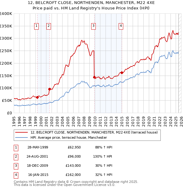 The below graph shows the average terraced house price in the Manchester local authority area over time, sourced from the HPI. The four 12 BELCROFT CLOSE sales between May 1999 and January 2015 have been plotted on the graph. A line has been extrapolated to show what the value of the property might have been over time, following each sale, had it maintained the same margin above or below the HPI (as a percentage). For example, the December 2009 sale was for 30% above the HPI. So the extrapolation line tracks at 30% above the HPI over time, until the January 2015 sale, where it rises to 32% above the HPI. The line then continues to track at 32% above the HPI.