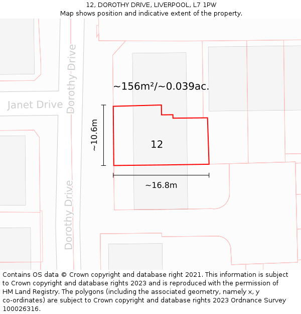 12 DOROTHY DRIVE sits on a plot of roughly 0.039 of an acre, or 156m². The below map shows the location of 12 DOROTHY DRIVE, an approximate outline of the building(s), and the indicative extent of the property. The plot extent is a Land Registry INSPIRE Index Polygon, and it is important to note that a title may include more than one polygon, whereas only one polygon is shown on the map (the polygon which intersects with the position of 12 DOROTHY DRIVE). The full extent of the land contained in any registered title can only be identified from the individual title plan. The maps on this page should not be relied upon to establish the extent of a title.