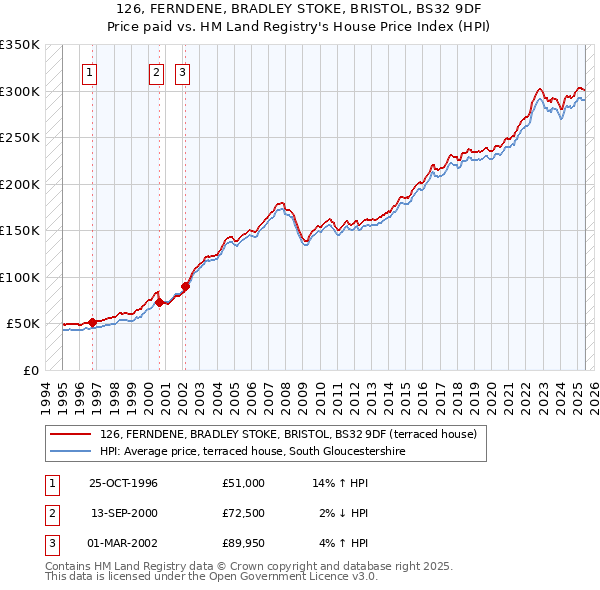 The below graph shows the average terraced house price in the South Gloucestershire local authority area over time, sourced from the HPI. The three 126 FERNDENE sales between October 1996 and March 2002 have been plotted on the graph. A line has been extrapolated to show what the value of the property might have been over time, following each sale, had it maintained the same margin above or below the HPI (as a percentage). For example, the September 2000 sale was for 2% below the HPI. So the extrapolation line tracks at 2% below the HPI over time, until the March 2002 sale, where it rises to 4% above the HPI. The line then continues to track at 4% above the HPI.