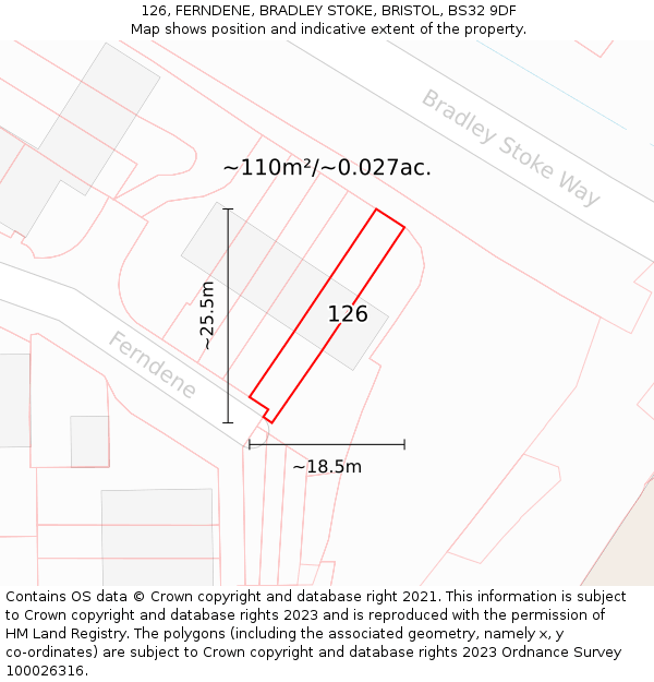 126 FERNDENE sits on a plot of roughly 0.027 of an acre, or 110m². The below map shows the location of 126 FERNDENE, an approximate outline of the building(s), and the indicative extent of the property. The plot extent is a Land Registry INSPIRE Index Polygon, and it is important to note that a title may include more than one polygon, whereas only one polygon is shown on the map (the polygon which intersects with the position of 126 FERNDENE). The full extent of the land contained in any registered title can only be identified from the individual title plan. The maps on this page should not be relied upon to establish the extent of a title.