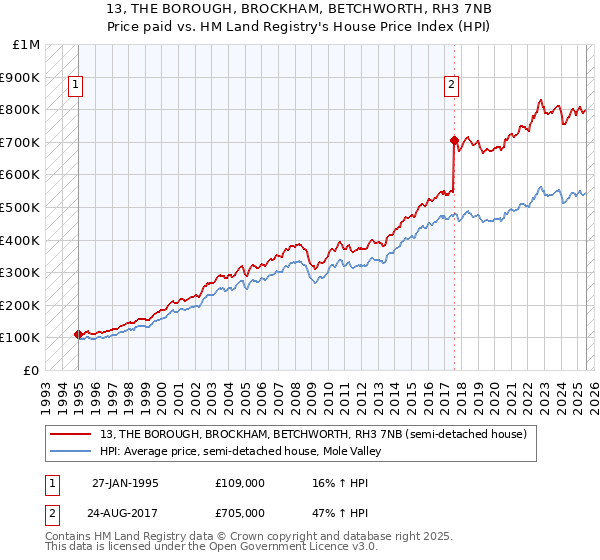 The below graph shows the average semi-detached house price in the Mole Valley local authority area over time, sourced from the HPI. The two 13 THE BOROUGH sales from January 1995 and August 2017 have been plotted on the graph. A line has been extrapolated to show what the value of the property might have been over time, following each sale, had it maintained the same margin above or below the HPI (as a percentage). For example, the January 1995 sale was for 16% above the HPI. So the extrapolation line tracks at 16% above the HPI over time, until the August 2017 sale, where it rises to 47% above the HPI. The line then continues to track at 47% above the HPI.