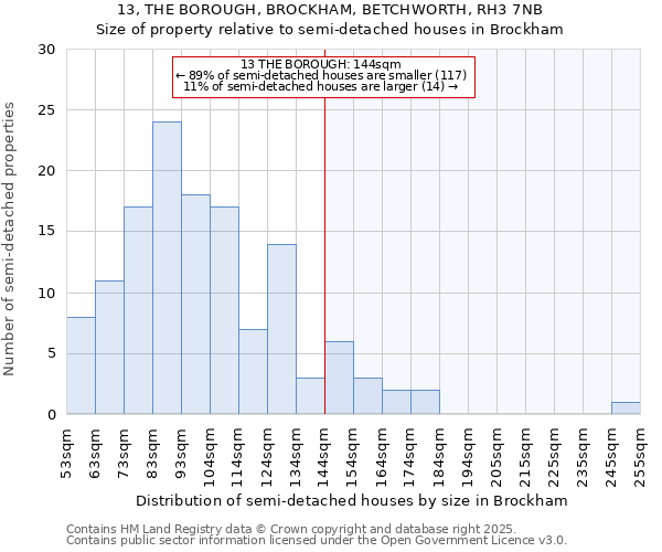 13 THE BOROUGH is 144m², which includes one extension, according to the EPC inspection conducted in February 2017. This puts it in the largest 50% of semi-detached houses houses in Brockham, based on EPC data. The below chart shows the distribution of semi-detached houses houses by size in Brockham, and where 13 THE BOROUGH lies on this distribution: 55% of semi-detached houses houses are smaller than 13 THE BOROUGH, and 43% of houses are larger. Note that EPC data is not available for all properties in Brockham.