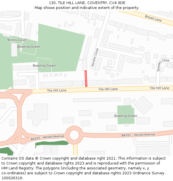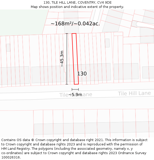 130 TILE HILL LANE sits on a plot of roughly 0.042 of an acre, or 168m². The below map shows the location of 130 TILE HILL LANE, an approximate outline of the building(s), and the indicative extent of the property. The plot extent is a Land Registry INSPIRE Index Polygon, and it is important to note that a title may include more than one polygon, whereas only one polygon is shown on the map (the polygon which intersects with the position of 130 TILE HILL LANE). The full extent of the land contained in any registered title can only be identified from the individual title plan. The maps on this page should not be relied upon to establish the extent of a title.