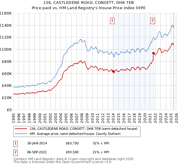 The below graph shows the average semi-detached house price in the County Durham local authority area over time, sourced from the HPI. The two 136 CASTLEDENE ROAD sales from January 2014 and September 2021 have been plotted on the graph. A line has been extrapolated to show what the value of the property might have been over time, following each sale, had it maintained the same margin above or below the HPI (as a percentage). For example, the January 2014 sale was for 31% below the HPI. So the extrapolation line tracks at 31% below the HPI over time, until the September 2021 sale, where it rises to 21% below the HPI. The line then continues to track at 21% below the HPI.