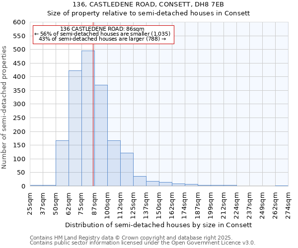 136 CASTLEDENE ROAD is 86m² according to the EPC inspection conducted in August 2013. This puts it in the smallest 20% of semi-detached houses houses in Consett, based on EPC data. The below chart shows the distribution of semi-detached houses houses by size in Consett, and where 136 CASTLEDENE ROAD lies on this distribution: 17% of semi-detached houses houses are smaller than 136 CASTLEDENE ROAD, and 82% of houses are larger. Note that EPC data is not available for all properties in Consett.
