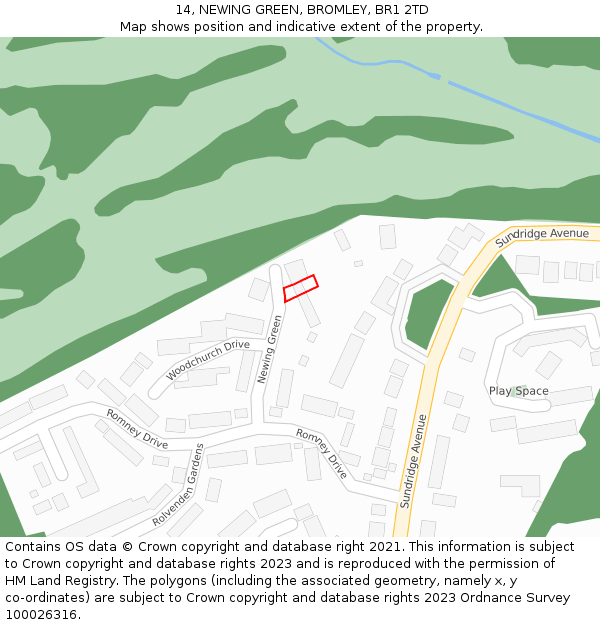 14 NEWING GREEN sits on a plot of roughly 0.073 of an acre, or 295m². The below map shows the location of 14 NEWING GREEN, an approximate outline of the building(s), and the indicative extent of the property. The plot extent is a Land Registry INSPIRE Index Polygon, and it is important to note that a title may include more than one polygon, whereas only one polygon is shown on the map (the polygon which intersects with the position of 14 NEWING GREEN). The full extent of the land contained in any registered title can only be identified from the individual title plan. The maps on this page should not be relied upon to establish the extent of a title.
