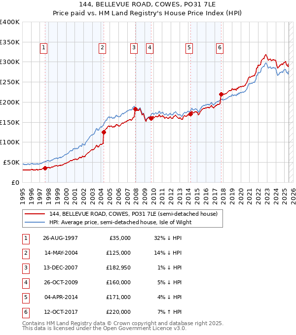 The below graph shows the average semi-detached house price in the Isle of Wight local authority area over time, sourced from the HPI. The six 144 BELLEVUE ROAD sales between August 1997 and October 2017 have been plotted on the graph. A line has been extrapolated to show what the value of the property might have been over time, following each sale, had it maintained the same margin above or below the HPI (as a percentage). For example, the April 2014 sale was for 4% below the HPI. So the extrapolation line tracks at 4% below the HPI over time, until the October 2017 sale, where it rises to 7% above the HPI. The line then continues to track at 7% above the HPI.