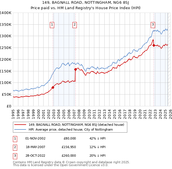 The below graph shows the average detached house price in the City of Nottingham local authority area over time, sourced from the HPI. The three 149 BAGNALL ROAD sales between November 2002 and October 2022 have been plotted on the graph. A line has been extrapolated to show what the value of the property might have been over time, following each sale, had it maintained the same margin above or below the HPI (as a percentage). For example, the May 2007 sale was for 12% below the HPI. So the extrapolation line tracks at 12% below the HPI over time, until the October 2022 sale, where it falls to 20% below the HPI. The line then continues to track at 20% below the HPI.