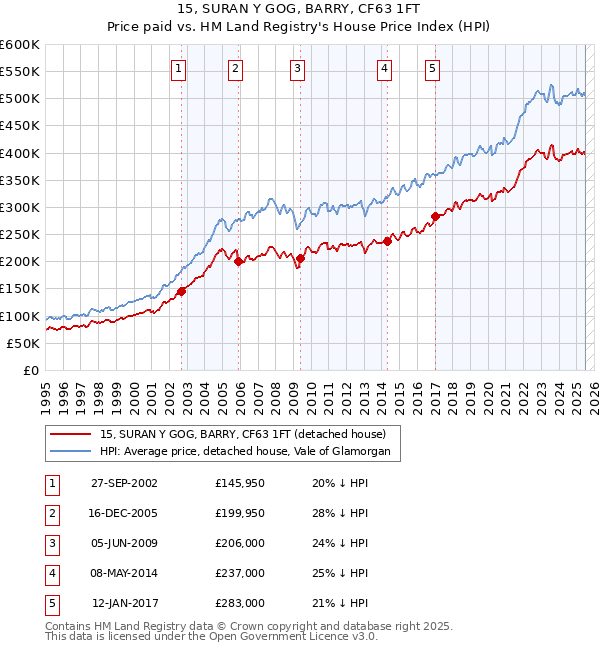The below graph shows the average detached house price in the Vale of Glamorgan local authority area over time, sourced from the HPI. The five 15 SURAN Y GOG sales between September 2002 and January 2017 have been plotted on the graph. A line has been extrapolated to show what the value of the property might have been over time, following each sale, had it maintained the same margin above or below the HPI (as a percentage). For example, the May 2014 sale was for 25% below the HPI. So the extrapolation line tracks at 25% below the HPI over time, until the January 2017 sale, where it rises to 21% below the HPI. The line then continues to track at 21% below the HPI.