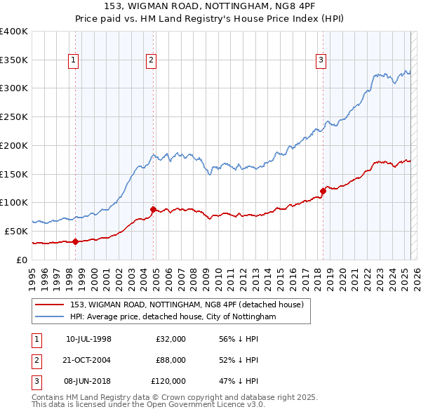 The below graph shows the average detached house price in the City of Nottingham local authority area over time, sourced from the HPI. The three 153 WIGMAN ROAD sales between July 1998 and June 2018 have been plotted on the graph. A line has been extrapolated to show what the value of the property might have been over time, following each sale, had it maintained the same margin above or below the HPI (as a percentage). For example, the October 2004 sale was for 52% below the HPI. So the extrapolation line tracks at 52% below the HPI over time, until the June 2018 sale, where it rises to 47% below the HPI. The line then continues to track at 47% below the HPI.