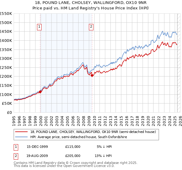 The below graph shows the average semi-detached house price in the South Oxfordshire local authority area over time, sourced from the HPI. The two 18 POUND LANE sales from December 1999 and August 2009 have been plotted on the graph. A line has been extrapolated to show what the value of the property might have been over time, following each sale, had it maintained the same margin above or below the HPI (as a percentage). For example, the December 1999 sale was for 5% below the HPI. So the extrapolation line tracks at 5% below the HPI over time, until the August 2009 sale, where it falls to 13% below the HPI. The line then continues to track at 13% below the HPI.