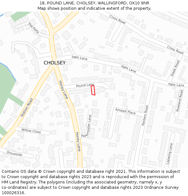 18 POUND LANE sits on a plot of roughly 0.046 of an acre, or 188m². The below map shows the location of 18 POUND LANE, an approximate outline of the building(s), and the indicative extent of the property. The plot extent is a Land Registry INSPIRE Index Polygon, and it is important to note that a title may include more than one polygon, whereas only one polygon is shown on the map (the polygon which intersects with the position of 18 POUND LANE). The full extent of the land contained in any registered title can only be identified from the individual title plan. The maps on this page should not be relied upon to establish the extent of a title.