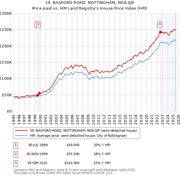 The below graph shows the average semi-detached house price in the City of Nottingham local authority area over time, sourced from the HPI. The three 19 BASFORD ROAD sales between July 1999 and September 2022 have been plotted on the graph. A line has been extrapolated to show what the value of the property might have been over time, following each sale, had it maintained the same margin above or below the HPI (as a percentage). For example, the November 1999 sale was for 18% above the HPI. So the extrapolation line tracks at 18% above the HPI over time, until the September 2022 sale, where it falls to 15% above the HPI. The line then continues to track at 15% above the HPI.