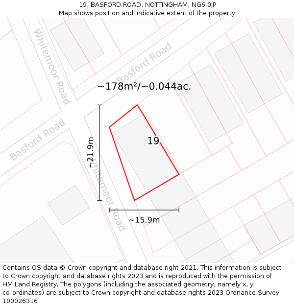 19 BASFORD ROAD sits on a plot of roughly 0.044 of an acre, or 178m². The below map shows the location of 19 BASFORD ROAD, an approximate outline of the building(s), and the indicative extent of the property. The plot extent is a Land Registry INSPIRE Index Polygon, and it is important to note that a title may include more than one polygon, whereas only one polygon is shown on the map (the polygon which intersects with the position of 19 BASFORD ROAD). The full extent of the land contained in any registered title can only be identified from the individual title plan. The maps on this page should not be relied upon to establish the extent of a title.