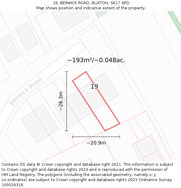 19 BERWICK ROAD sits on a plot of roughly 0.048 of an acre, or 193m². The below map shows the location of 19 BERWICK ROAD, an approximate outline of the building(s), and the indicative extent of the property. The plot extent is a Land Registry INSPIRE Index Polygon, and it is important to note that a title may include more than one polygon, whereas only one polygon is shown on the map (the polygon which intersects with the position of 19 BERWICK ROAD). The full extent of the land contained in any registered title can only be identified from the individual title plan. The maps on this page should not be relied upon to establish the extent of a title.