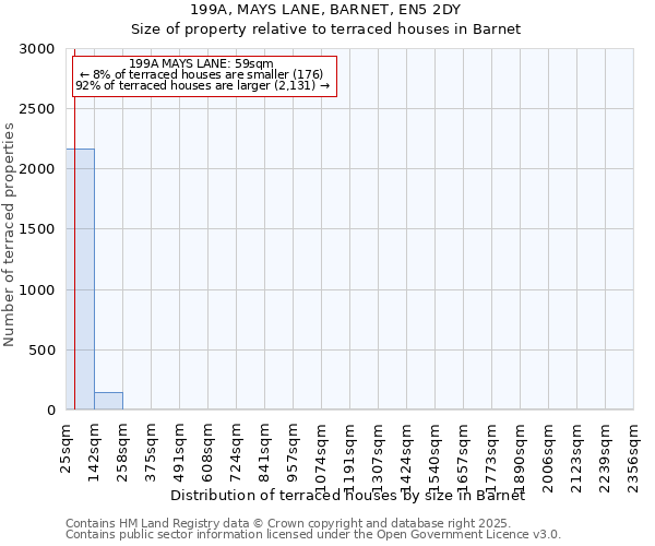 199A MAYS LANE is 59m² according to the EPC inspection conducted in August 2017. This puts it in the smallest 10% of terraced houses houses in Barnet, based on EPC data. The below chart shows the distribution of terraced houses houses by size in Barnet, and where 199A MAYS LANE lies on this distribution: 2% of terraced houses houses are smaller than 199A MAYS LANE, and 98% of houses are larger. Note that EPC data is not available for all properties in Barnet.