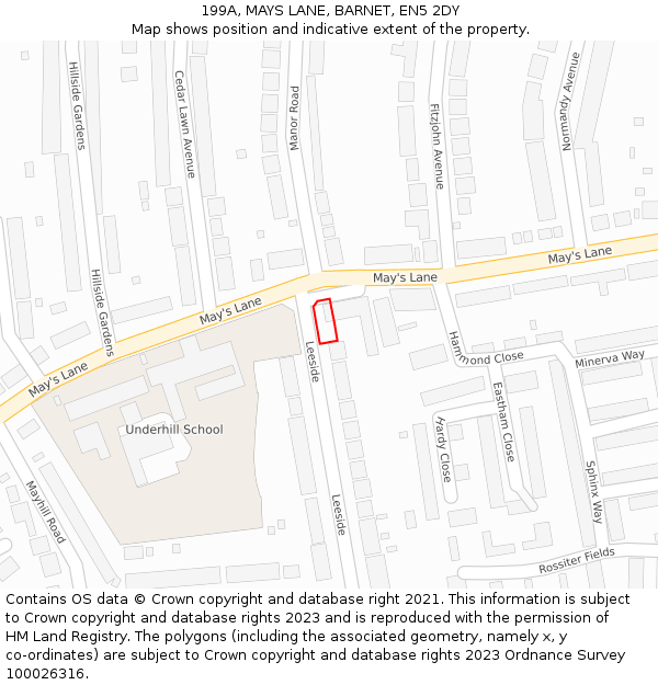 199A MAYS LANE sits on a plot of roughly 0.107 of an acre, or 432m². The below map shows the location of 199A MAYS LANE, an approximate outline of the building(s), and the indicative extent of the property. The plot extent is a Land Registry INSPIRE Index Polygon, and it is important to note that a title may include more than one polygon, whereas only one polygon is shown on the map (the polygon which intersects with the position of 199A MAYS LANE). The full extent of the land contained in any registered title can only be identified from the individual title plan. The maps on this page should not be relied upon to establish the extent of a title.
