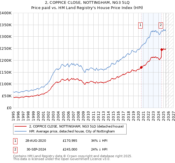 The below graph shows the average detached house price in the City of Nottingham local authority area over time, sourced from the HPI. The two 2 COPPICE CLOSE sales from August 2020 and September 2024 have been plotted on the graph. A line has been extrapolated to show what the value of the property might have been over time, following each sale, had it maintained the same margin above or below the HPI (as a percentage). For example, the August 2020 sale was for 34% below the HPI. So the extrapolation line tracks at 34% below the HPI over time, until the September 2024 sale, where it rises to 24% below the HPI. The line then continues to track at 24% below the HPI.