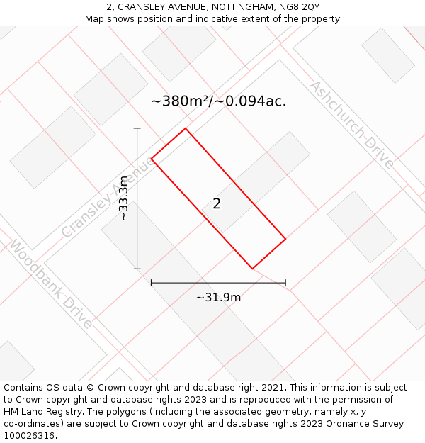 2 CRANSLEY AVENUE sits on a plot of roughly 0.094 of an acre, or 380m². The below map shows the location of 2 CRANSLEY AVENUE, an approximate outline of the building(s), and the indicative extent of the property. The plot extent is a Land Registry INSPIRE Index Polygon, and it is important to note that a title may include more than one polygon, whereas only one polygon is shown on the map (the polygon which intersects with the position of 2 CRANSLEY AVENUE). The full extent of the land contained in any registered title can only be identified from the individual title plan. The maps on this page should not be relied upon to establish the extent of a title.
