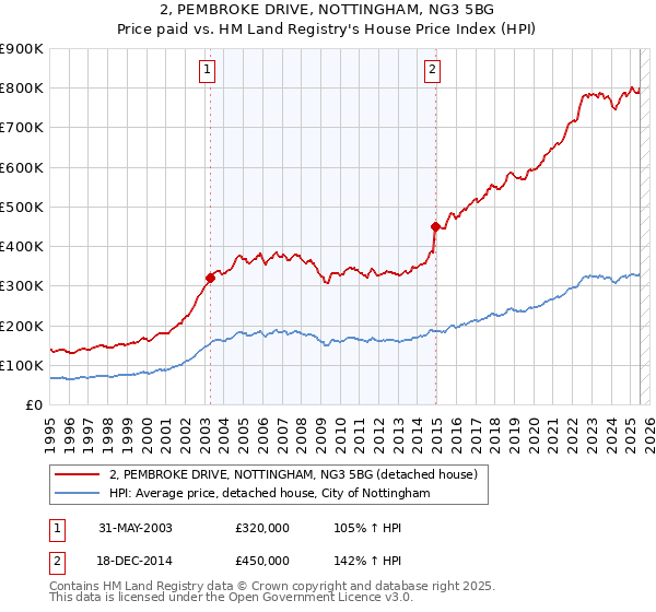 The below graph shows the average detached house price in the City of Nottingham local authority area over time, sourced from the HPI. The two 2 PEMBROKE DRIVE sales from May 2003 and December 2014 have been plotted on the graph. A line has been extrapolated to show what the value of the property might have been over time, following each sale, had it maintained the same margin above or below the HPI (as a percentage). For example, the May 2003 sale was for 105% above the HPI. So the extrapolation line tracks at 105% above the HPI over time, until the December 2014 sale, where it rises to 142% above the HPI. The line then continues to track at 142% above the HPI.