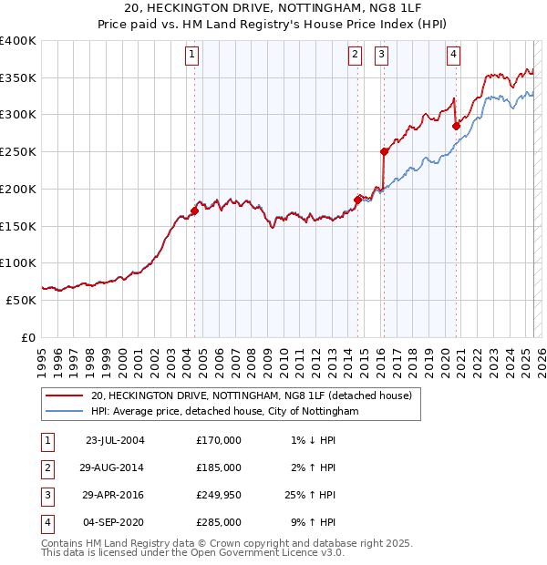 The below graph shows the average detached house price in the City of Nottingham local authority area over time, sourced from the HPI. The four 20 HECKINGTON DRIVE sales between July 2004 and September 2020 have been plotted on the graph. A line has been extrapolated to show what the value of the property might have been over time, following each sale, had it maintained the same margin above or below the HPI (as a percentage). For example, the April 2016 sale was for 25% above the HPI. So the extrapolation line tracks at 25% above the HPI over time, until the September 2020 sale, where it falls to 9% above the HPI. The line then continues to track at 9% above the HPI.