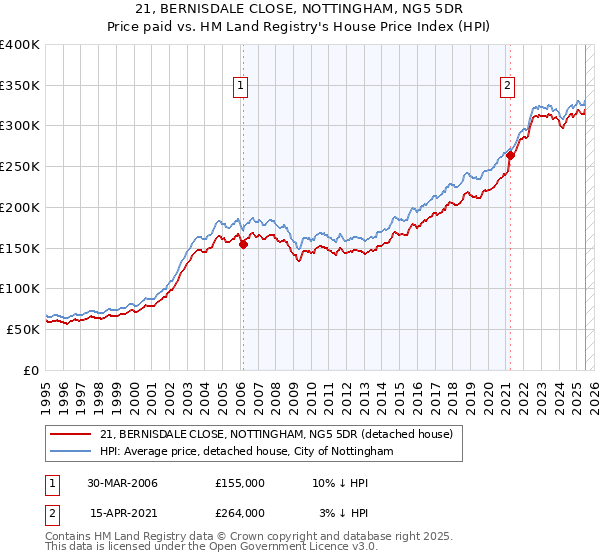 The below graph shows the average detached house price in the City of Nottingham local authority area over time, sourced from the HPI. The two 21 BERNISDALE CLOSE sales from March 2006 and April 2021 have been plotted on the graph. A line has been extrapolated to show what the value of the property might have been over time, following each sale, had it maintained the same margin above or below the HPI (as a percentage). For example, the March 2006 sale was for 10% below the HPI. So the extrapolation line tracks at 10% below the HPI over time, until the April 2021 sale, where it rises to 3% below the HPI. The line then continues to track at 3% below the HPI.