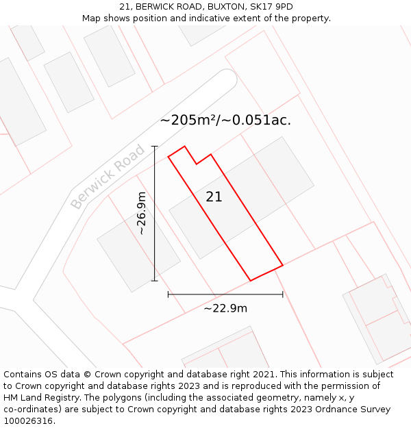 21 BERWICK ROAD sits on a plot of roughly 0.051 of an acre, or 205m². The below map shows the location of 21 BERWICK ROAD, an approximate outline of the building(s), and the indicative extent of the property. The plot extent is a Land Registry INSPIRE Index Polygon, and it is important to note that a title may include more than one polygon, whereas only one polygon is shown on the map (the polygon which intersects with the position of 21 BERWICK ROAD). The full extent of the land contained in any registered title can only be identified from the individual title plan. The maps on this page should not be relied upon to establish the extent of a title.