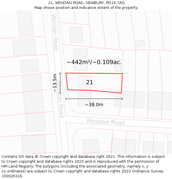 21 WENDAN ROAD sits on a plot of roughly 0.109 of an acre, or 442m². The below map shows the location of 21 WENDAN ROAD, an approximate outline of the building(s), and the indicative extent of the property. The plot extent is a Land Registry INSPIRE Index Polygon, and it is important to note that a title may include more than one polygon, whereas only one polygon is shown on the map (the polygon which intersects with the position of 21 WENDAN ROAD). The full extent of the land contained in any registered title can only be identified from the individual title plan. The maps on this page should not be relied upon to establish the extent of a title.