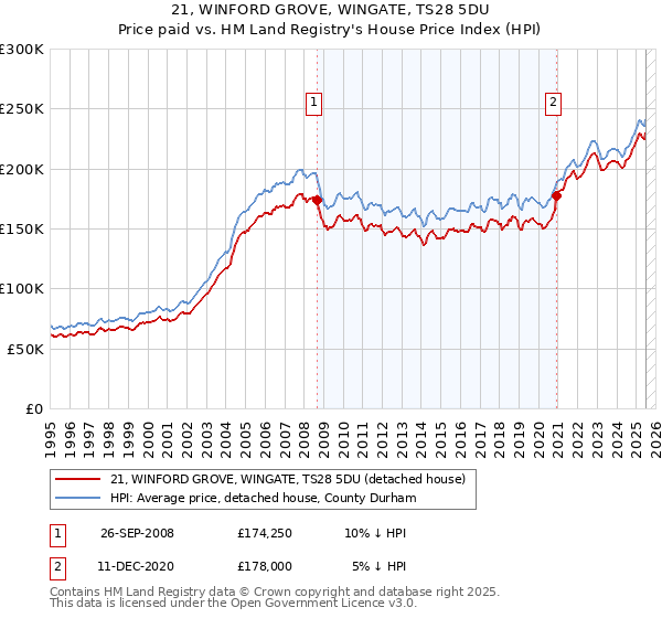 The below graph shows the average detached house price in the County Durham local authority area over time, sourced from the HPI. The two 21 WINFORD GROVE sales from September 2008 and December 2020 have been plotted on the graph. A line has been extrapolated to show what the value of the property might have been over time, following each sale, had it maintained the same margin above or below the HPI (as a percentage). For example, the September 2008 sale was for 10% below the HPI. So the extrapolation line tracks at 10% below the HPI over time, until the December 2020 sale, where it rises to 5% below the HPI. The line then continues to track at 5% below the HPI.