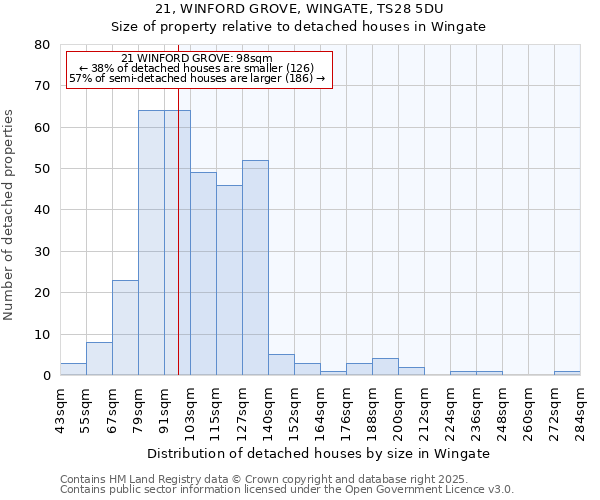 21 WINFORD GROVE is 98m², which includes one extension, according to the EPC inspection conducted in September 2019. This puts it in the smallest 40% of detached houses houses in Wingate, based on EPC data. The below chart shows the distribution of detached houses houses by size in Wingate, and where 21 WINFORD GROVE lies on this distribution: 38% of detached houses houses are smaller than 21 WINFORD GROVE, and 57% of houses are larger. Note that EPC data is not available for all properties in Wingate.
