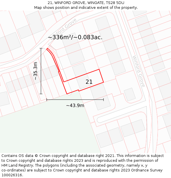 21 WINFORD GROVE sits on a plot of roughly 0.083 of an acre, or 336m². The below map shows the location of 21 WINFORD GROVE, an approximate outline of the building(s), and the indicative extent of the property. The plot extent is a Land Registry INSPIRE Index Polygon, and it is important to note that a title may include more than one polygon, whereas only one polygon is shown on the map (the polygon which intersects with the position of 21 WINFORD GROVE). The full extent of the land contained in any registered title can only be identified from the individual title plan. The maps on this page should not be relied upon to establish the extent of a title.