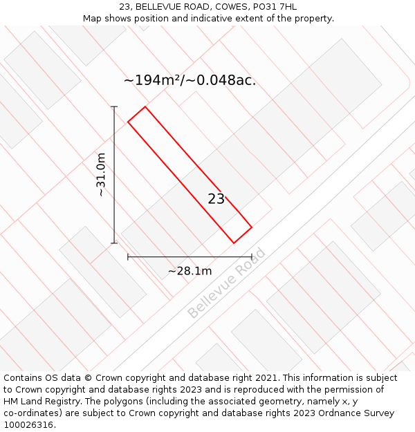 23 BELLEVUE ROAD sits on a plot of roughly 0.048 of an acre, or 194m². The below map shows the location of 23 BELLEVUE ROAD, an approximate outline of the building(s), and the indicative extent of the property. The plot extent is a Land Registry INSPIRE Index Polygon, and it is important to note that a title may include more than one polygon, whereas only one polygon is shown on the map (the polygon which intersects with the position of 23 BELLEVUE ROAD). The full extent of the land contained in any registered title can only be identified from the individual title plan. The maps on this page should not be relied upon to establish the extent of a title.
