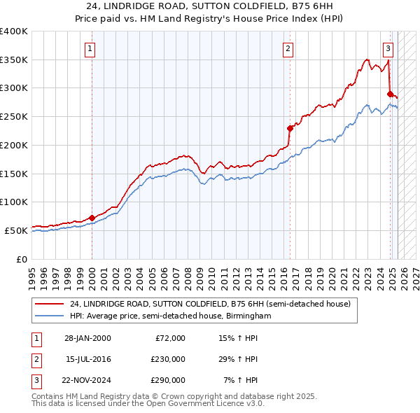 The below graph shows the average semi-detached house price in the Birmingham local authority area over time, sourced from the HPI. The three 24 LINDRIDGE ROAD sales between January 2000 and November 2024 have been plotted on the graph. A line has been extrapolated to show what the value of the property might have been over time, following each sale, had it maintained the same margin above or below the HPI (as a percentage). For example, the July 2016 sale was for 29% above the HPI. So the extrapolation line tracks at 29% above the HPI over time, until the November 2024 sale, where it falls to 7% above the HPI. The line then continues to track at 7% above the HPI.