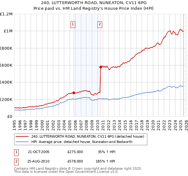 The below graph shows the average detached house price in the Nuneaton and Bedworth local authority area over time, sourced from the HPI. The two 240 LUTTERWORTH ROAD sales from October 2005 and August 2010 have been plotted on the graph. A line has been extrapolated to show what the value of the property might have been over time, following each sale, had it maintained the same margin above or below the HPI (as a percentage). For example, the October 2005 sale was for 35% above the HPI. So the extrapolation line tracks at 35% above the HPI over time, until the August 2010 sale, where it rises to 185% above the HPI. The line then continues to track at 185% above the HPI.