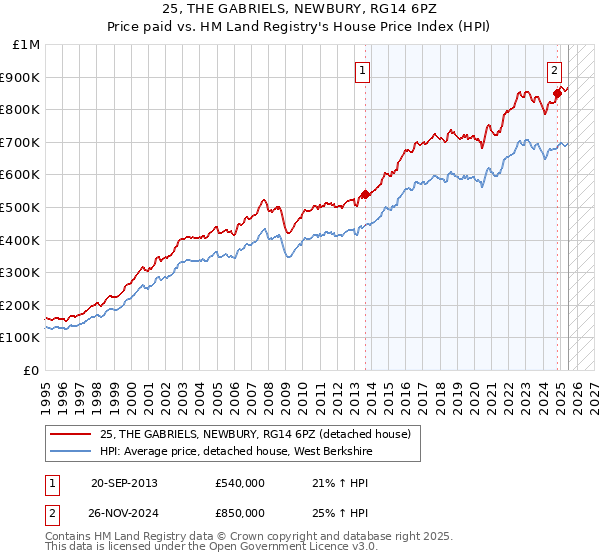 The below graph shows the average detached house price in the West Berkshire local authority area over time, sourced from the HPI. The two 25 THE GABRIELS sales from September 2013 and November 2024 have been plotted on the graph. A line has been extrapolated to show what the value of the property might have been over time, following each sale, had it maintained the same margin above or below the HPI (as a percentage). For example, the September 2013 sale was for 21% above the HPI. So the extrapolation line tracks at 21% above the HPI over time, until the November 2024 sale, where it rises to 25% above the HPI. The line then continues to track at 25% above the HPI.
