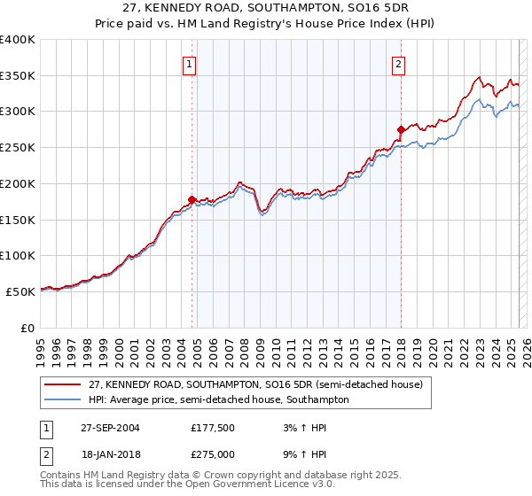 The below graph shows the average semi-detached house price in the Southampton local authority area over time, sourced from the HPI. The two 27 KENNEDY ROAD sales from September 2004 and January 2018 have been plotted on the graph. A line has been extrapolated to show what the value of the property might have been over time, following each sale, had it maintained the same margin above or below the HPI (as a percentage). For example, the September 2004 sale was for 3% above the HPI. So the extrapolation line tracks at 3% above the HPI over time, until the January 2018 sale, where it rises to 9% above the HPI. The line then continues to track at 9% above the HPI.