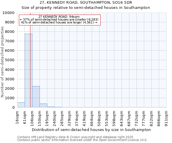 27 KENNEDY ROAD is 94m², which includes one extension, according to the EPC inspection conducted in July 2017. This puts it in the smallest 40% of semi-detached houses houses in Southampton, based on EPC data. The below chart shows the distribution of semi-detached houses houses by size in Southampton, and where 27 KENNEDY ROAD lies on this distribution: 39% of semi-detached houses houses are smaller than 27 KENNEDY ROAD, and 60% of houses are larger. Note that EPC data is not available for all properties in Southampton.