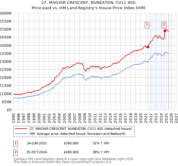 The below graph shows the average detached house price in the Nuneaton and Bedworth local authority area over time, sourced from the HPI. The two 27 MAGYAR CRESCENT sales from June 2021 and October 2024 have been plotted on the graph. A line has been extrapolated to show what the value of the property might have been over time, following each sale, had it maintained the same margin above or below the HPI (as a percentage). For example, the June 2021 sale was for 31% above the HPI. So the extrapolation line tracks at 31% above the HPI over time, until the October 2024 sale, where it rises to 39% above the HPI. The line then continues to track at 39% above the HPI.