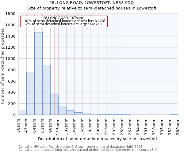 28 LONG ROAD is 107m² according to the EPC inspection conducted in March 2014. This puts it in the largest 40% of semi-detached houses houses in Lowestoft, based on EPC data. The below chart shows the distribution of semi-detached houses houses by size in Lowestoft, and where 28 LONG ROAD lies on this distribution: 60% of semi-detached houses houses are smaller than 28 LONG ROAD, and 39% of houses are larger. Note that EPC data is not available for all properties in Lowestoft.