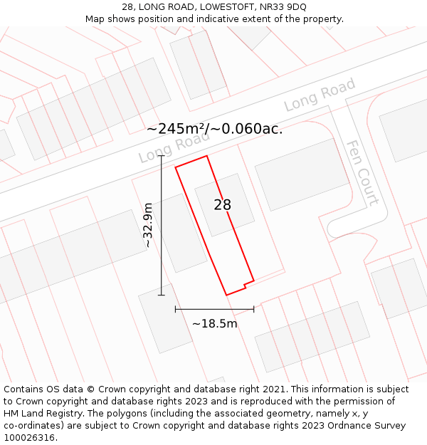 28 LONG ROAD sits on a plot of roughly 0.061 of an acre, or 245m². The below map shows the location of 28 LONG ROAD, an approximate outline of the building(s), and the indicative extent of the property. The plot extent is a Land Registry INSPIRE Index Polygon, and it is important to note that a title may include more than one polygon, whereas only one polygon is shown on the map (the polygon which intersects with the position of 28 LONG ROAD). The full extent of the land contained in any registered title can only be identified from the individual title plan. The maps on this page should not be relied upon to establish the extent of a title.
