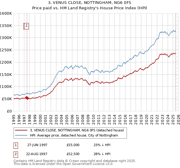 The below graph shows the average detached house price in the City of Nottingham local authority area over time, sourced from the HPI. The two 3 VENUS CLOSE sales from June 1997 and August 1997 have been plotted on the graph. A line has been extrapolated to show what the value of the property might have been over time, following each sale, had it maintained the same margin above or below the HPI (as a percentage). For example, the June 1997 sale was for 23% below the HPI. So the extrapolation line tracks at 23% below the HPI over time, until the August 1997 sale, where it falls to 28% below the HPI. The line then continues to track at 28% below the HPI.
