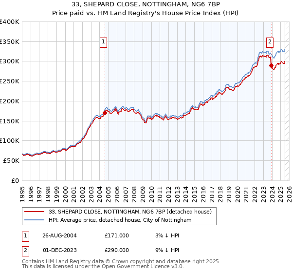 The below graph shows the average detached house price in the City of Nottingham local authority area over time, sourced from the HPI. The two 33 SHEPARD CLOSE sales from August 2004 and December 2023 have been plotted on the graph. A line has been extrapolated to show what the value of the property might have been over time, following each sale, had it maintained the same margin above or below the HPI (as a percentage). For example, the August 2004 sale was for 3% below the HPI. So the extrapolation line tracks at 3% below the HPI over time, until the December 2023 sale, where it falls to 9% below the HPI. The line then continues to track at 9% below the HPI.